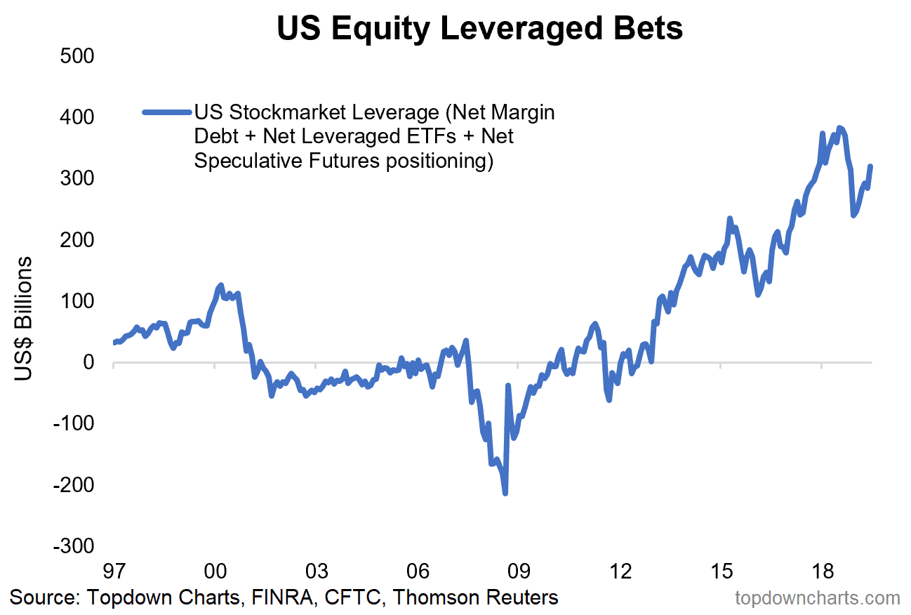 What about the aggregate picture? The next chart takes the dollar value of net margin debt, net leverage ETF AUM, and net speculative futures positioning.