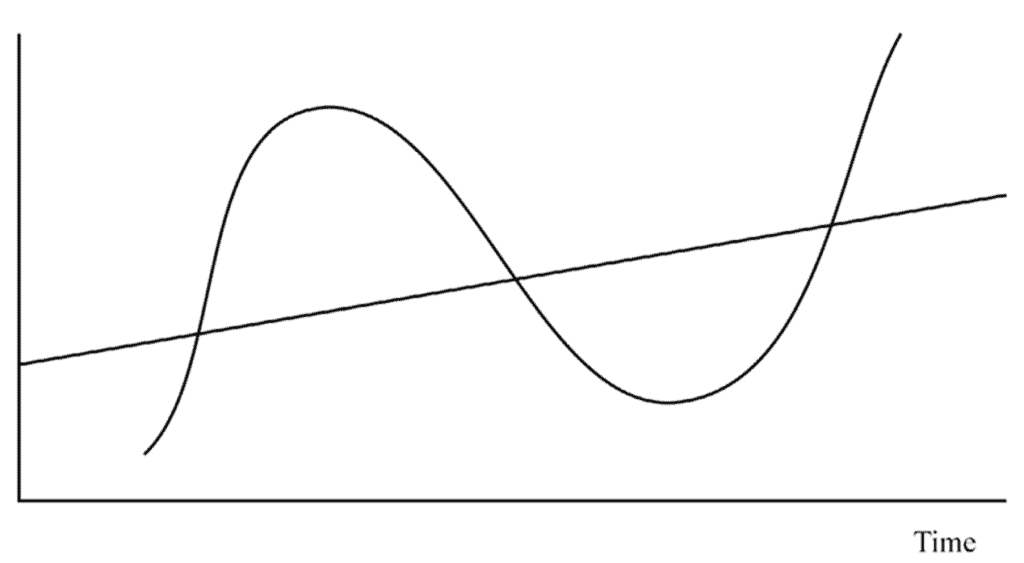 While there are peaks and valleys along the way, that line is moving up. I’m convinced that businesses will experience consistent growth over time. The problem is that, at times, investors push prices above that trend growth. This creates “market risk,” which is different from “business risk.” Better portfolio diversification can help you deal with business risks. You’ve got to find ways to deal with market risks. That steady line across the middle follows a growth rate of approximately 5% per year above the cost of debt. That’s about how much gain per year you can expect from the stock market. If AAA-rated companies can borrow at 5%, expect your large-cap index fund or ETF to grow at 10%. That’s the predictable return you will get. But depending on where we sit in the cycle, investors may find themselves facing some real issues. If prices are bid up way above that long-term trend, your market risk is high (like today). But prices will always revert back to trend and almost always drop down below the trend (the straight line in the middle of the above chart). This is due to investor psychology. It’s just the way it is, and 36 years of working with investors tells me it won’t ever change.