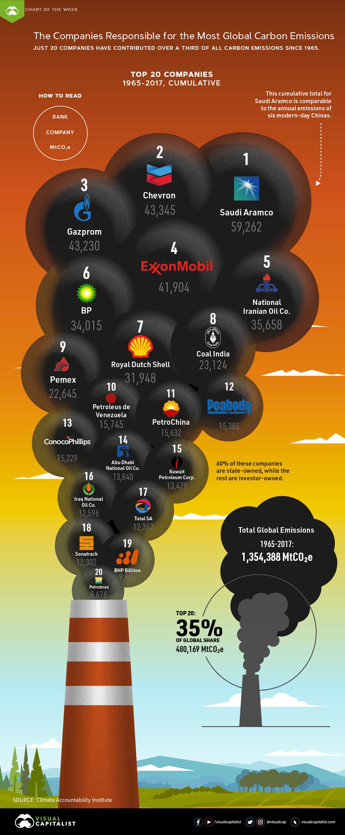 This week’s chart draws on a dataset from the Climate Accountability Institute, and highlights the companies which have been responsible for the most carbon emissions in the past half-century.