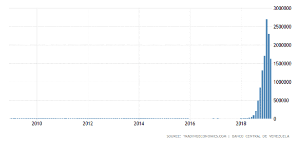 As a consequence of the Venezuelan government’s disastrous political and economic decisions over the decades, Venezuela’s inflation rate also skyrocketed to unprecedented levels, reaching an all-time high of 2,688,670 percent. The graph below shows the inflation rate in chronological order: