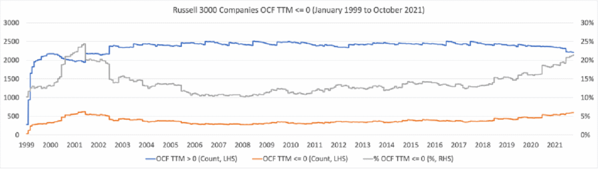 Since 2006, the trend has been for more and more companies to burn operating cash flow.