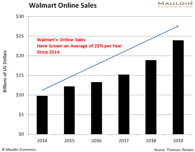 And, as I’ll explain shortly, buying shares of Walmart is a great way for risk-adverse income investors to play the online shopping trend.