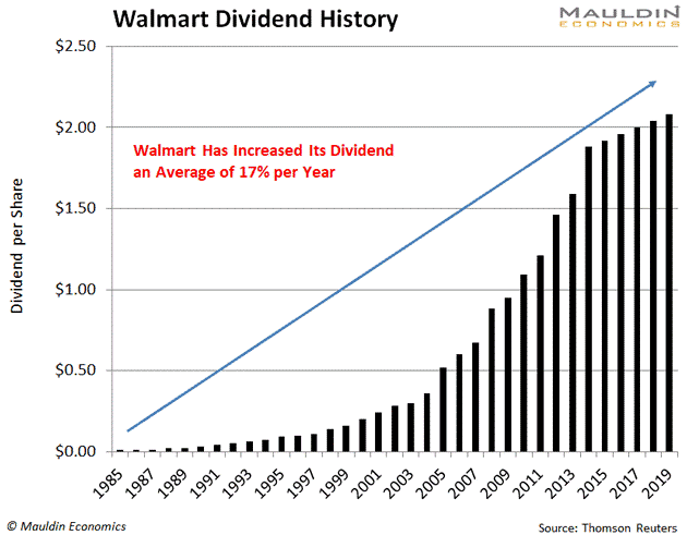 Walmart also has one of the most reliable dividends. It’s part of an elite group called the Dividend Aristocrats—companies that have increased their dividends every year for 25 years or more.
