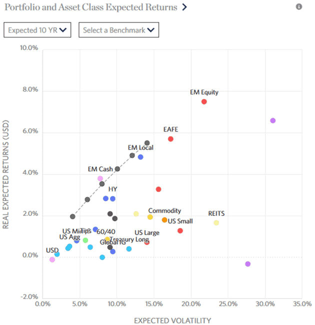 Research Affiliates further calculates expected volatility, which lets them produce the classic risk-reward scatterplot below.