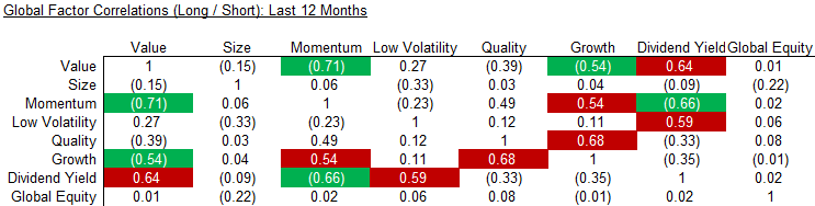 The correlation matrix below highlights the global one-year factor correlations. We can observe strong relationships between Momentum and Growth, Quality and Growth, and Low Volatility and Dividend Yield. Some of these are structural, e.g. Quality and Growth in the US have been correlated for many years. Low Volatility and Dividend Yield do not tend to be correlated, but both currently exhibit interest rate-sensitivity. Some factors show low or negative correlations, which can be accretive for creating diversified multi-factor portfolios.