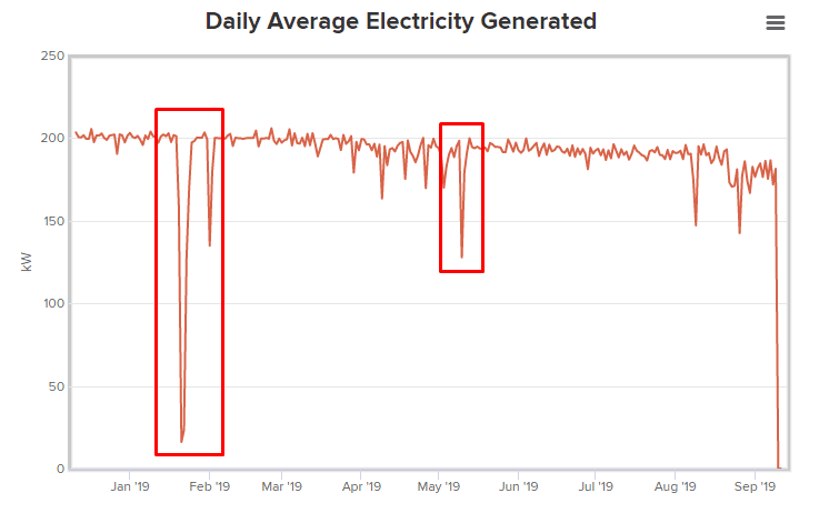 We were able to corroborate the claims by looking into the public NYSERDA data for Home Depot Greenbush, which shows an interruption in service in late January 2019. Efficiency numbers dropped across the board for a three-day period.