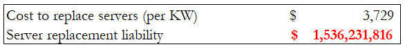- Server replacement liability: All told, we assume 1 server replacement per average 13 year remaining contract life, given the company’s historic 4-7 year replacement rates.