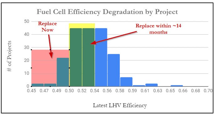 As we have seen from older Bloom project data in California and New York, fuel cell replacements were typically done in the 48%-50% efficiency range.