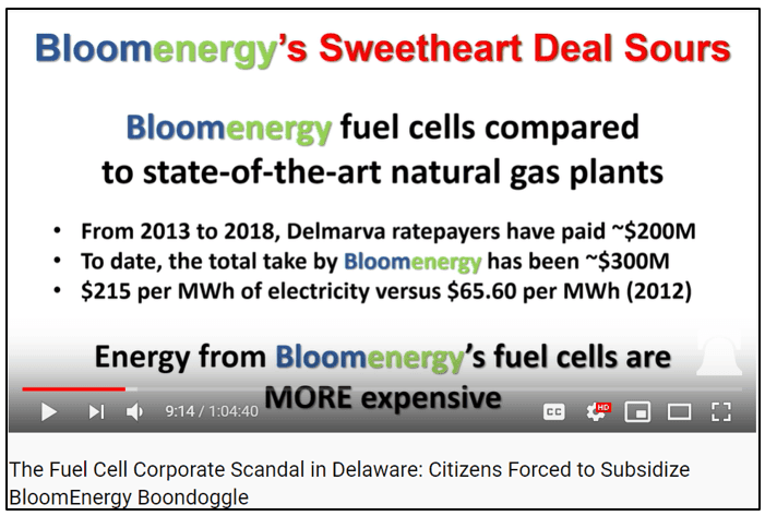 “…the company was thrown a lifeline. They weren’t doing that well. You’ve got the Obama administration – I think it was Joe Biden put the onus on the people in that state to subsidize Bloom Energy. Bloom Energy made a bunch of promises about employees that they never kept. But the people in Delaware are still paying. It’s crazy.”