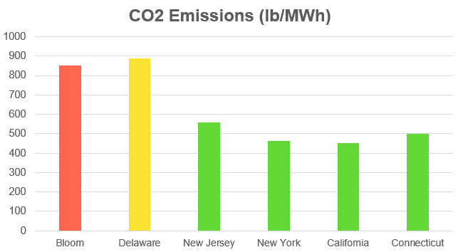 Bloom is also not a “clean” energy company. Instead of reducing emissions, data we collected from hundreds of Bloom projects shows that they generate more CO2 than the electric grid in key states they operate in and produce CO2 levels comparable to modern natural gas power plants.