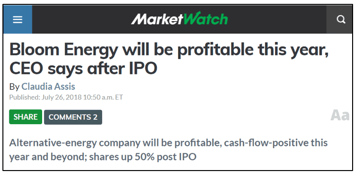 Fuel cells, in general, have been understood by the scientific community since the early 1800’s and have been a largely unprofitable industry to date. Much of Bloom’s popularity (and funding) was based on the idea that it could “break through” as the first profitable and sustainable fuel cell company.