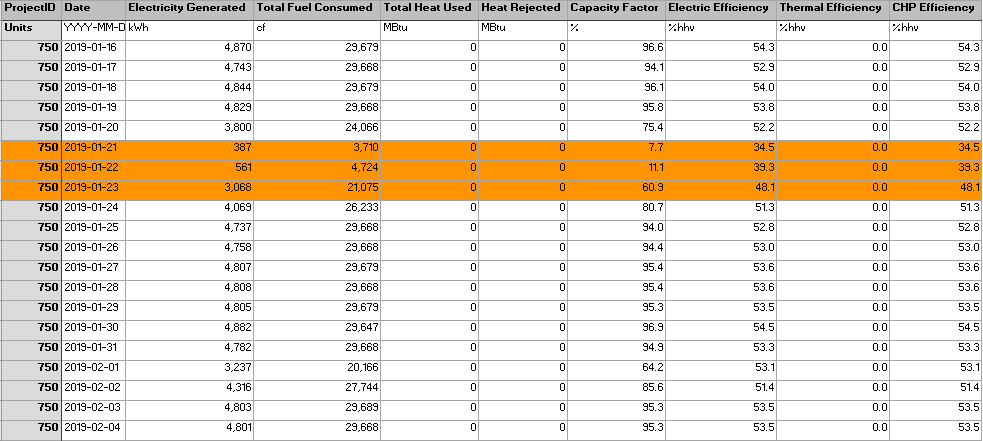 There were some instances where generators exhibited strange performance in the data (such as generators operating at below 40% efficiency or seeming to break). With the efficiency, output and emissions samples we attempted to scrub out data points that appeared to be mostly negative outliers in order to give Bloom the benefit of the doubt (such as generators beginning to operate significantly below or above standard LHV efficiency between 40% to 70%, then sharply reverting). Had we included these potential outliers, Bloom’s performance would have likely been significantly worse.