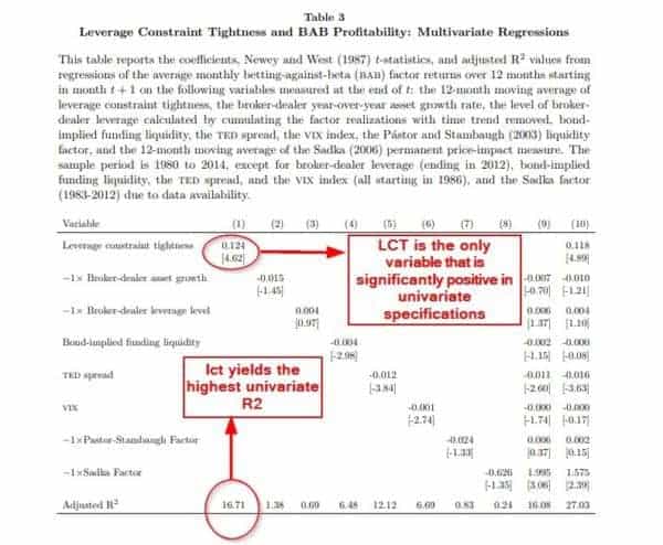 - Their measure of leverage constraint tightness (LCT) strongly and significantly predicts returns of the BAB factor, which is long levered low-beta stocks and short de-levered high-beta stocks.