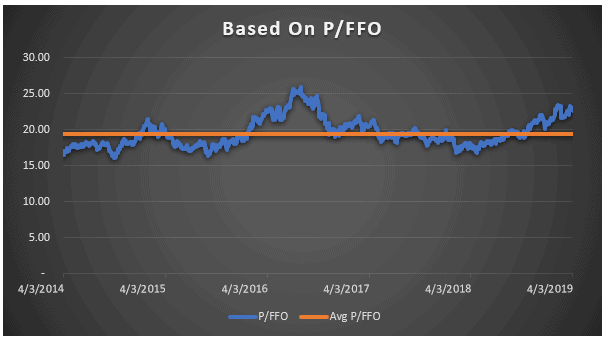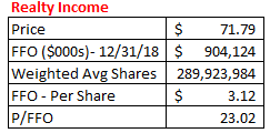 Using 12/31/2018 figures and today’s closing price of$71.79, the stock currently trades at a P/FFO of 23x. That is high for RealtyIncome, as they have traded at an average P/FFO of about 19x, suggesting thestock is currently overvalued based on recent five-year historical averages.Here is a look at a charted graph of Realty Income’s daily P/FFO over the lastfive years.