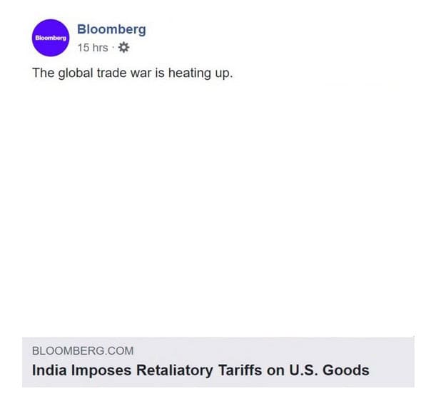 Bloomberg financial site reports that India is imposing retaliatory trade tariffs on the United States effective on June 16, 2019… the Trade War is spreading: