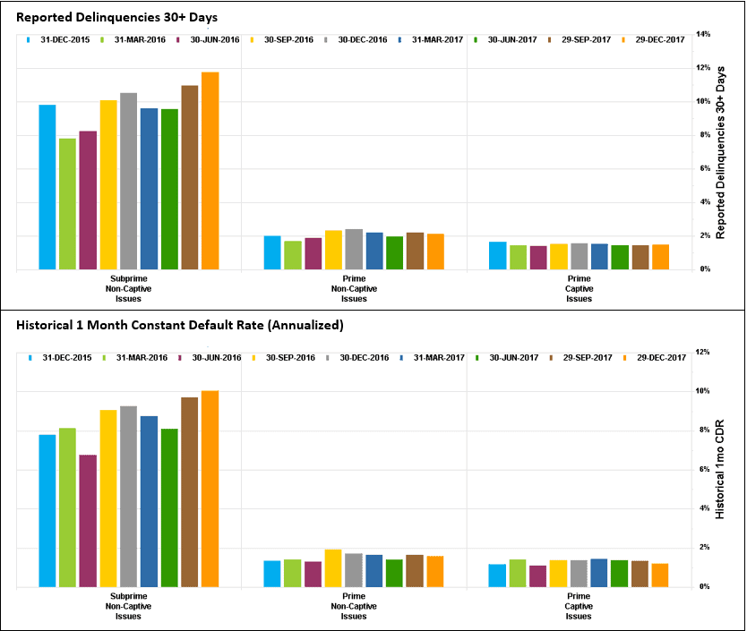 Reported delinquencies and constant default rates (CDR) tell the same story. Both metrics are relatively stable over time in all subcategories except for the subprime non-captive issues. Not only are both 30+ day delinquencies and one-month CDR significantly higher than their peers, they are trending upwards over time. The same relationship holds when you expand to longer periods of delinquency or observed CDR period, although the absolute levels drop.
