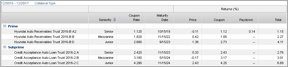 With prices hovering close to par, coupon is the main driver of return. The seniority decision mentioned earlier involves many factors, but put most simply is a risk/reward tradeoff easily observed through the inverse relationship between coupon and seniority. Consider the fixed rate deal examples below. The Credit Acceptance Loan Trust (subprime collateral) and Hyundai Auto Receivables Trust (prime collateral) were both issued in 2016. As expected, investors willing to accept more risk (through less credit-worthy collateral or subordinated claims to cash flows) are generally compensated with higher returns.