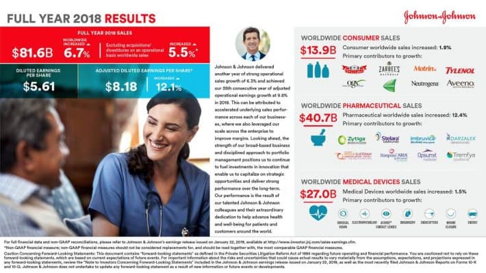 For example, J&J had adjusted earnings-per-share of $8.18 in 2018, which represented 12.1% growth from the previous year. Organic revenue increased 5.5% for 2018.