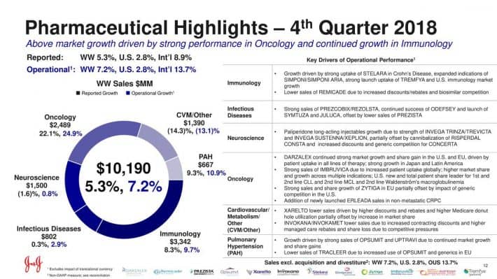 Within the pharmaceutical segment, two of the company’s best-performing areas continue to be oncology and immunology. Oncology sales rose by nearly 25% in constant currency last year, while the immunology segment grew by 9.7% in 2018.