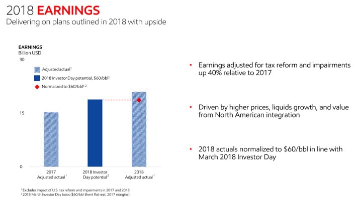 Upstream earnings totaled $14.25 billion ($7.74 billion in 2017), downstream earnings equaled $6.05 billion ($5.0 billion in 2017) and the chemical segment earned $3.36 billion ($4.18 billion in 2017). Earnings-per-share came in at $4.88 for the year.