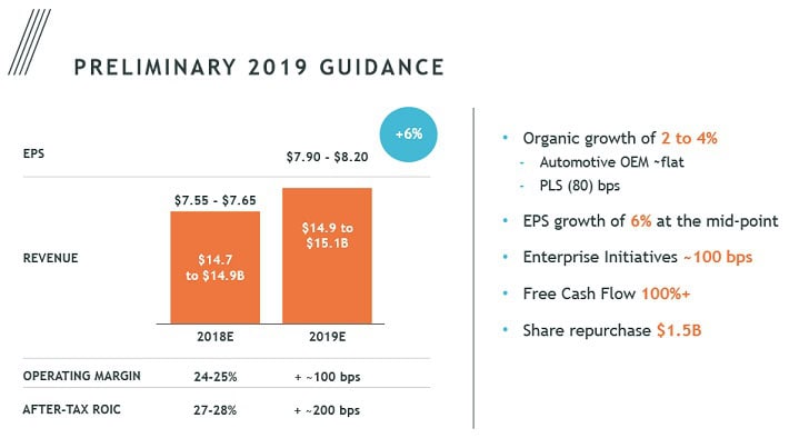 Illinois Tool Works guides for earnings-per-share in a range of $7.90 to $8.20 during fiscal 2019, a projected increase of 6% at the midpoint of guidance.